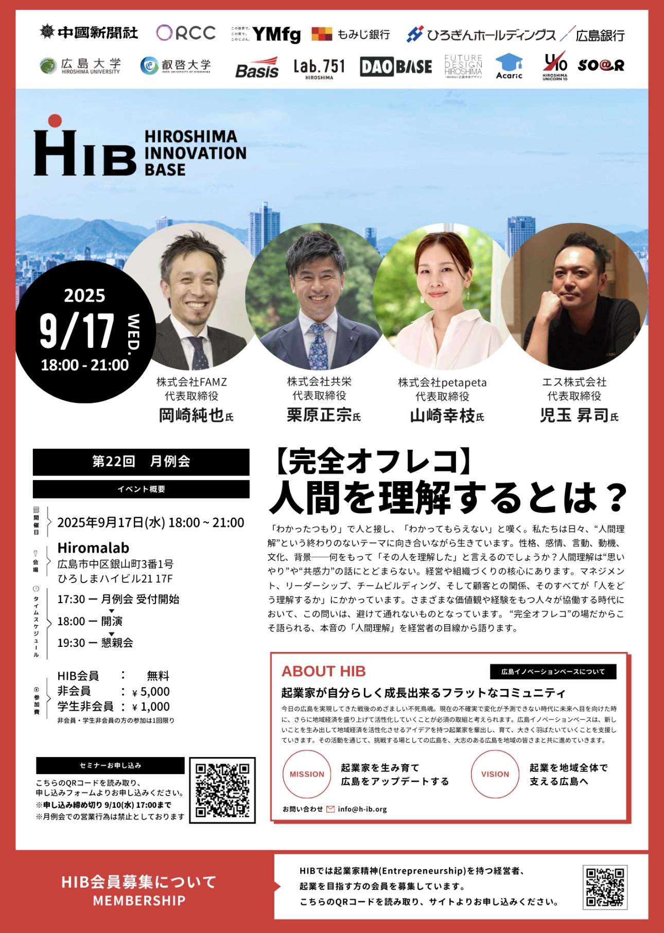 広島イノベーションベース(HIB)は、広島を拠点にした起業家が集い、学びや交流を通じて互いの成長を支援するコミュニティです。毎月の月例会では、ゲスト講演やディスカッションを通じて経営の知見を深める場が設けられています。